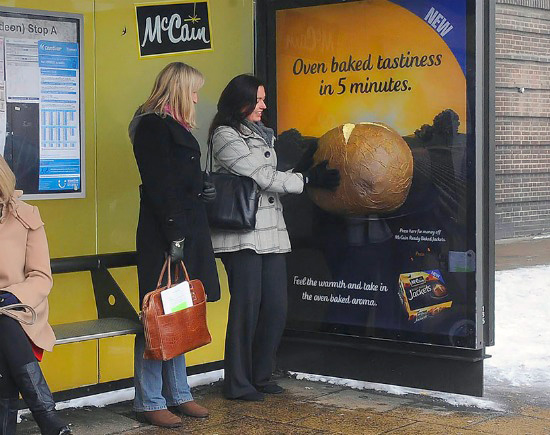 Imaginar que estáis esperando el autobús en uno de esos fríos días de invierno, con viento helado y calabobos. Son las 2 de la tarde y el autobús no llega, mientras vuestras tripas empiezan a emitir extraños y preocupantes sonidos…cuando de repente te alcanza un intenso aroma a patata caliente recién salida del horno… mmmmmmmmmmmm… alzas la vista, y vez una señora calentándose las manos en una patata asada gigante, o en una recreación de ella, insertada en la marquesina de la parada del autobús.