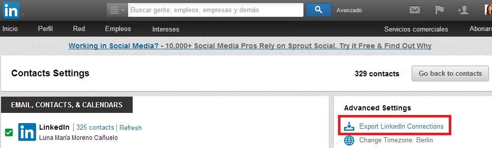 - Cómo exportar tu lista de contactos de Linkedin: Desde Red’ –> ‘Contactos’ dale a la opción de ‘Configuracion’ o ‘Settings’ que verás a la derecha del título Contactos. Después verás a la derecha la ‘Configuración avanzada’ y ahí debes clicar en la opción Exportar contactos de Linkedin.